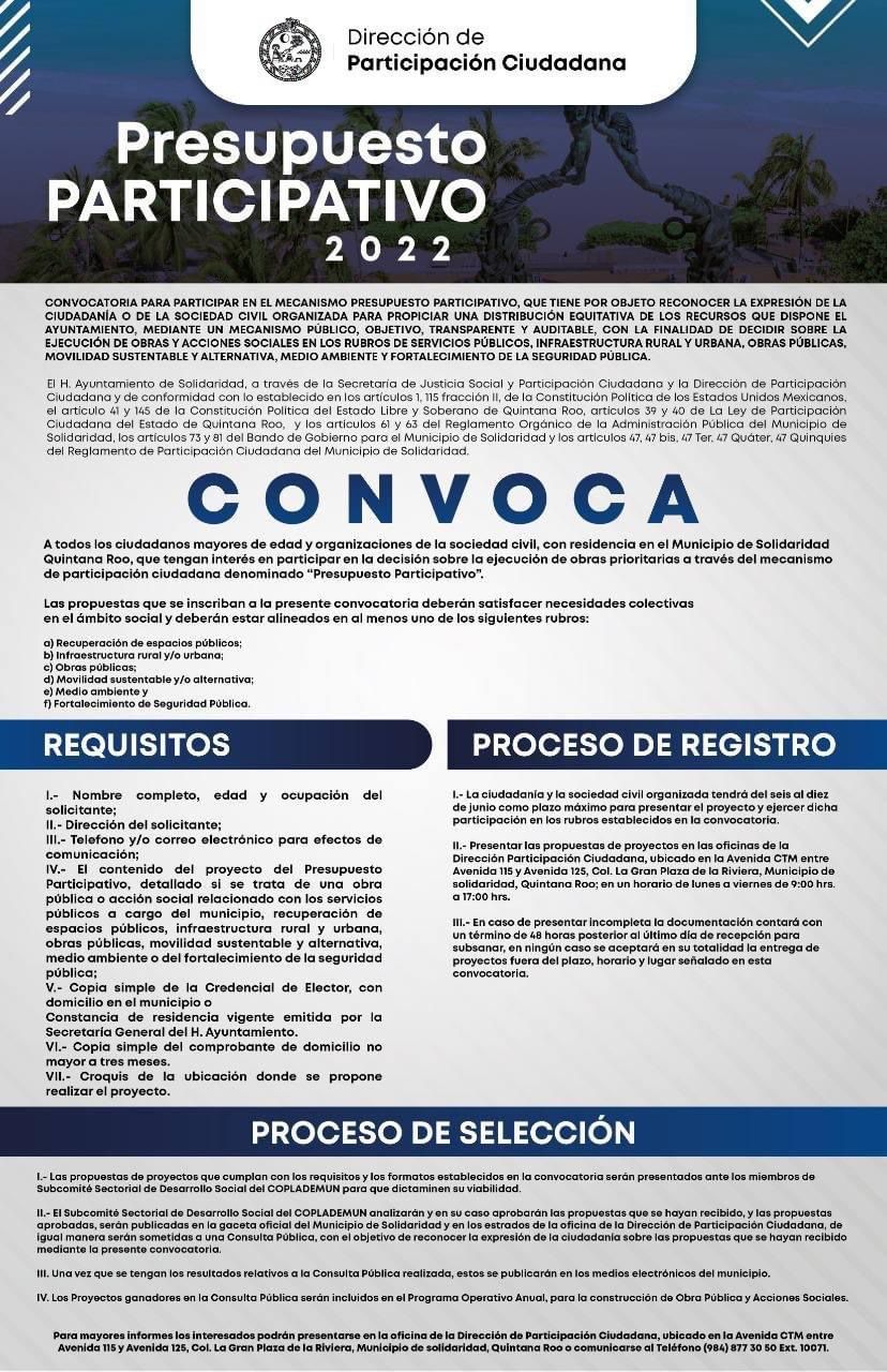 El Presupuesto Participativo 2022 forma parte de los mecanismos para reconocer la expresión de la ciudadanía o de la sociedad civil organizada para propiciar una distribución equitativa de los recursos que dispone el ayuntamiento. Para ello, en la convocatoria se tomarán en cuenta las propuestas de ciudadanos mayores de edad y organizaciones de la sociedad civil con residencia en el municipio de Solidaridad que tengan interés en participar en la decisión sobre la ejecución de obras prioritarias.