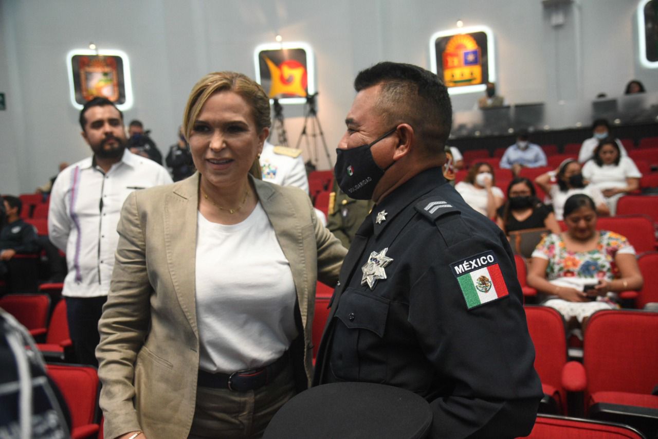 Playa del Carmen, Solidaridad a 31 de mayo del 2022.- Lili Campos Miranda, presidente municipal de Solidaridad acompañó al policía Jesús Gabriel Dzul Piña, perteneciente a la Secretaría de Seguridad Pública y Tránsito Municipal de Solidaridad, quien recibió la medalla al Mérito Policial de Quintana Roo, otorgada por la Honorable XVI Legislatura Constitucional del Estado.