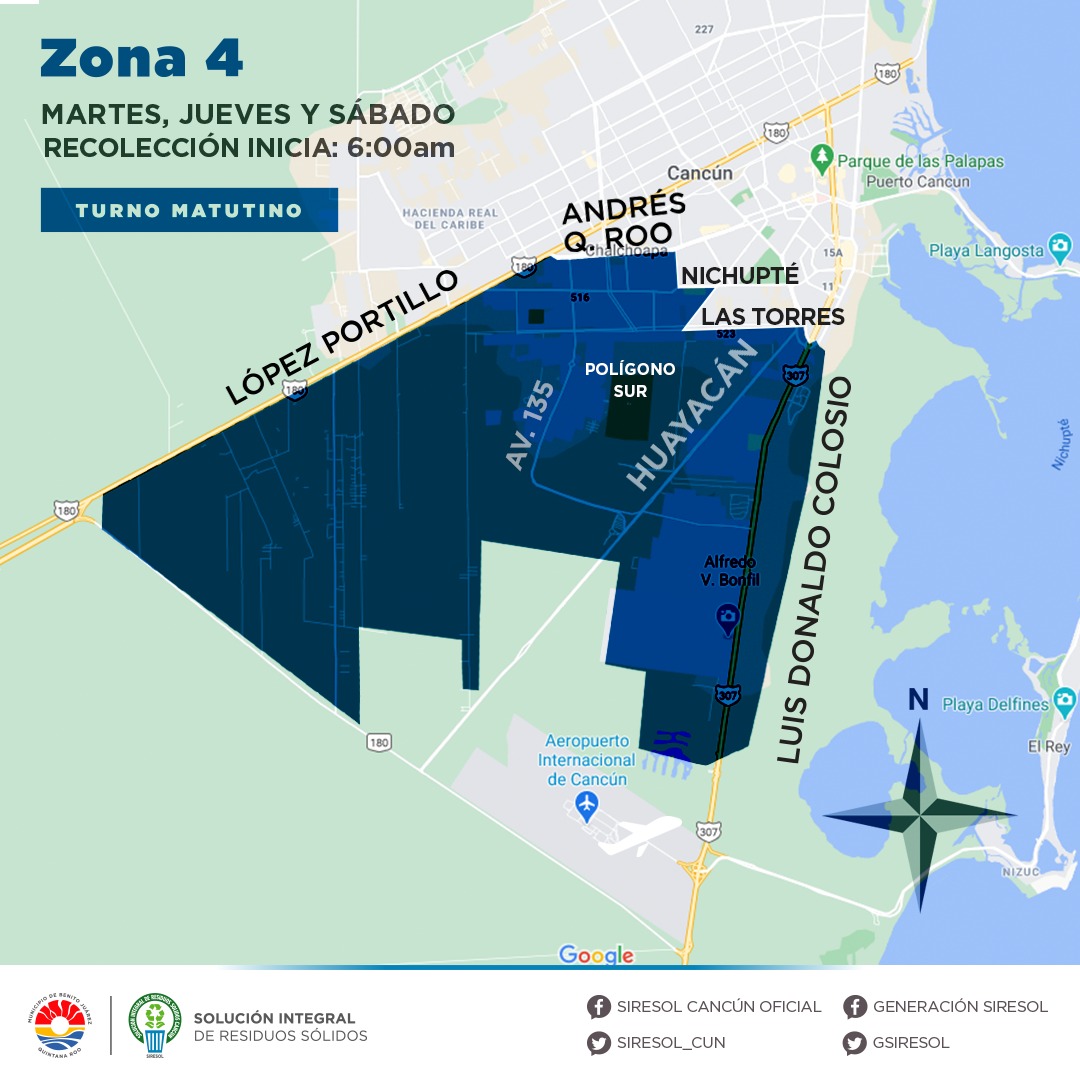 La segunda adecuación realizada fue en la zona 4 en el sur de la ciudad, cuyo polígono de alcance es los límites de avenidas como Andrés Quintana Roo, Nichupté, Las Torres, José López Portillo y Boulevard Luis Donaldo Colosio, al cual le corresponde la recolección los martes, jueves y sábado, también desde 6:00 horas.