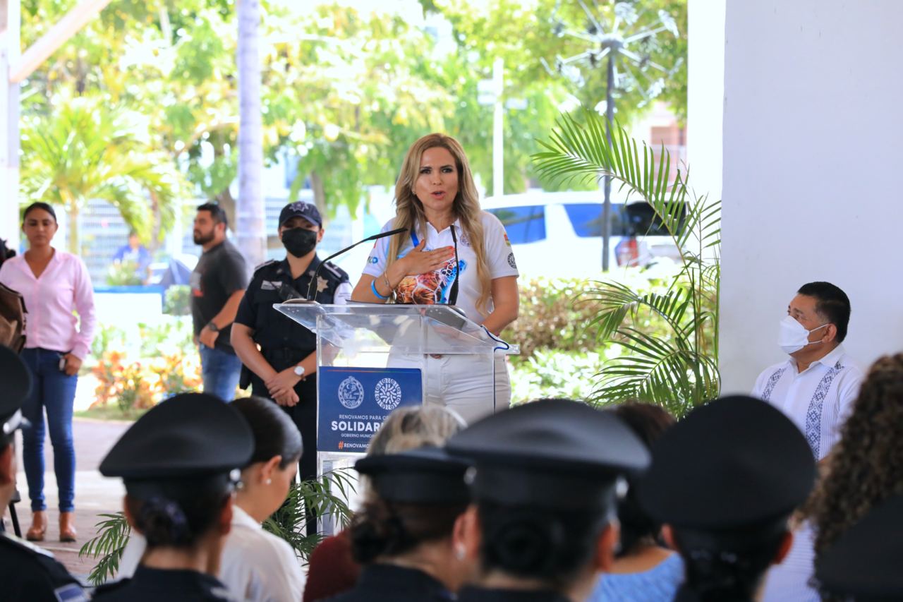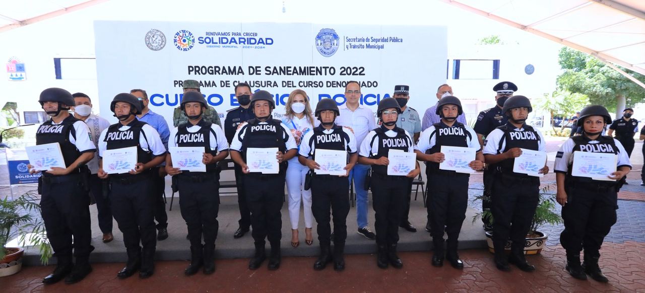 Playa del Carmen, Solidaridad, 26 de julio de 2022.- La presidenta municipal de Solidaridad Lili Campos encabezó la entrega de constancias a 28 nuevos policías que concluyeron el curso básico policial, mismos que fortalecerán el trabajo operativo de la corporación turística y tránsito, en beneficio de la seguridad de visitantes y solidarenses.