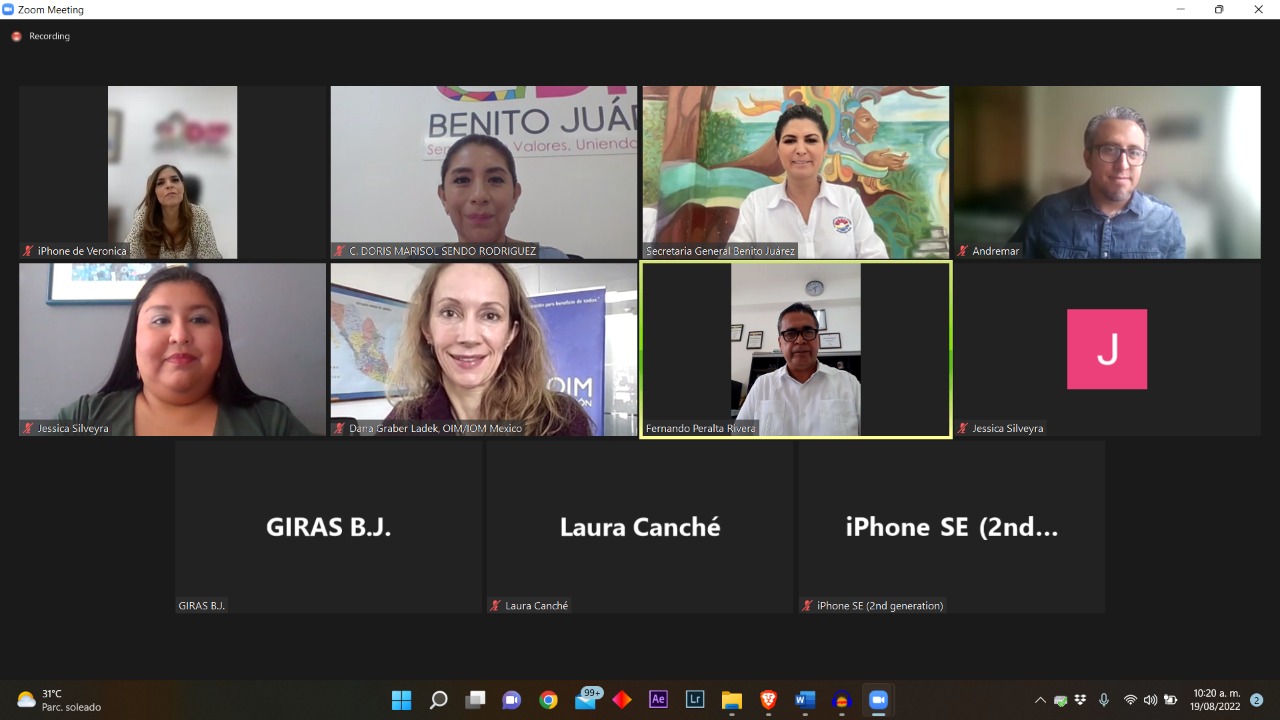 Cancún, Q.R., a 19 de agosto de 2022.- El Ayuntamiento de Benito Juárez y la Organización Internacional para las Migraciones (OIM) suscribirán en octubre próximo un Acuerdo de Cooperación que reforzará los principios y la práctica de la protección integral en Cancún de las personas procedentes de diversos países.