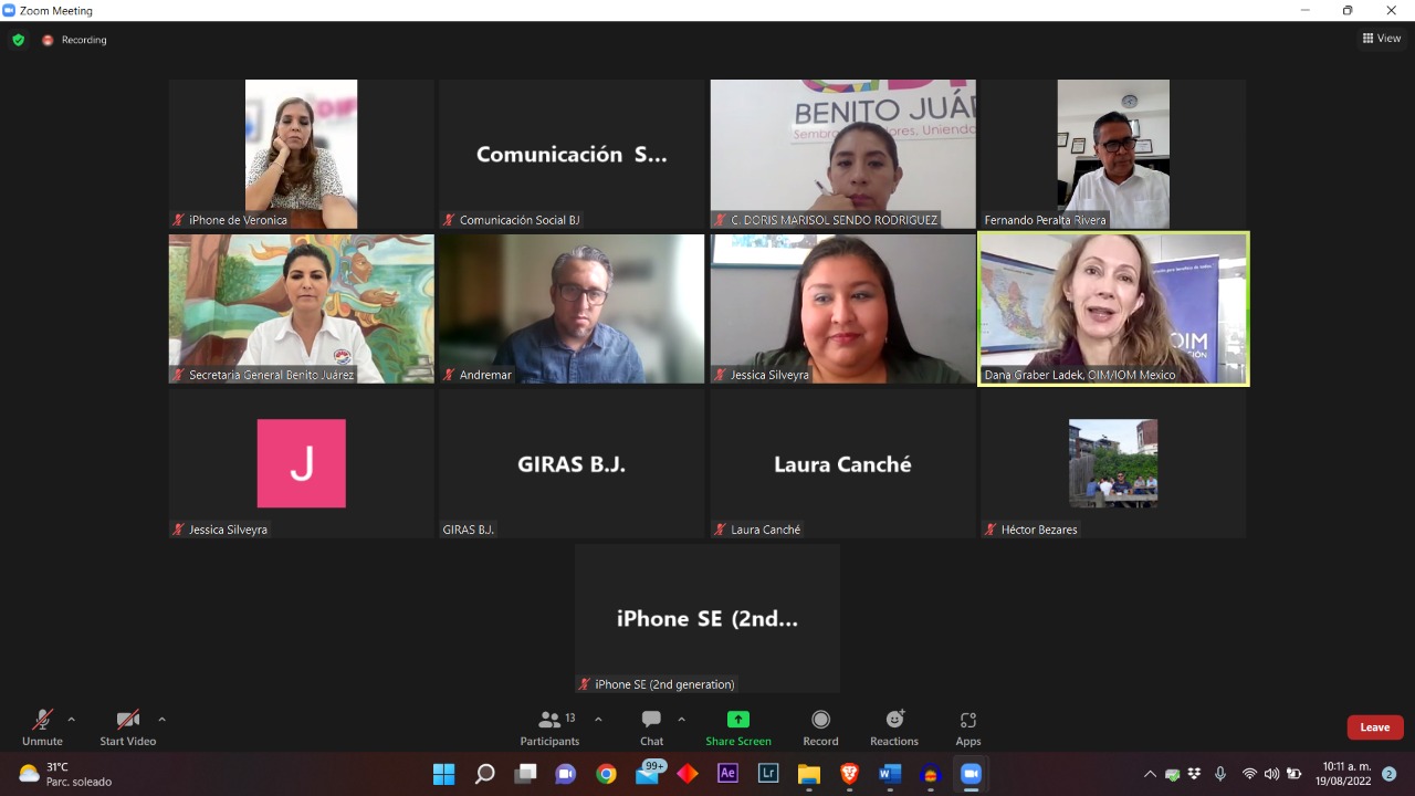 Durante la sesión estuvieron presentes la representante de la misión OIM capítulo México, Dana Graber Ladek; enlace nacional de Ventanillas Informáticas sobre Migración de la OIM, Andremar Galván; la presidenta honoraria del Sistema DIF Benito Juárez, Verónica Lezama Espinosa y la encargada de despacho de la Dirección del DIF Municipal, Marisol Sendo López; entre otros.