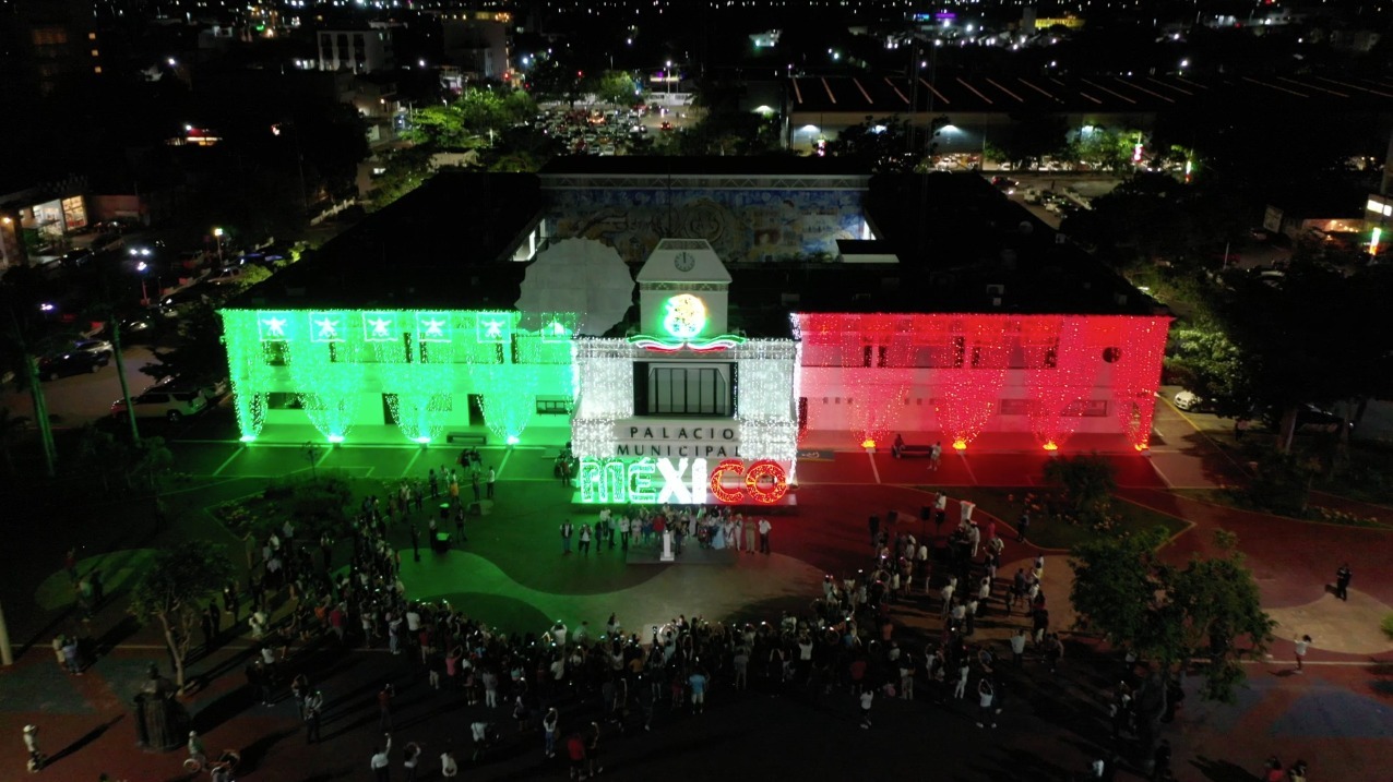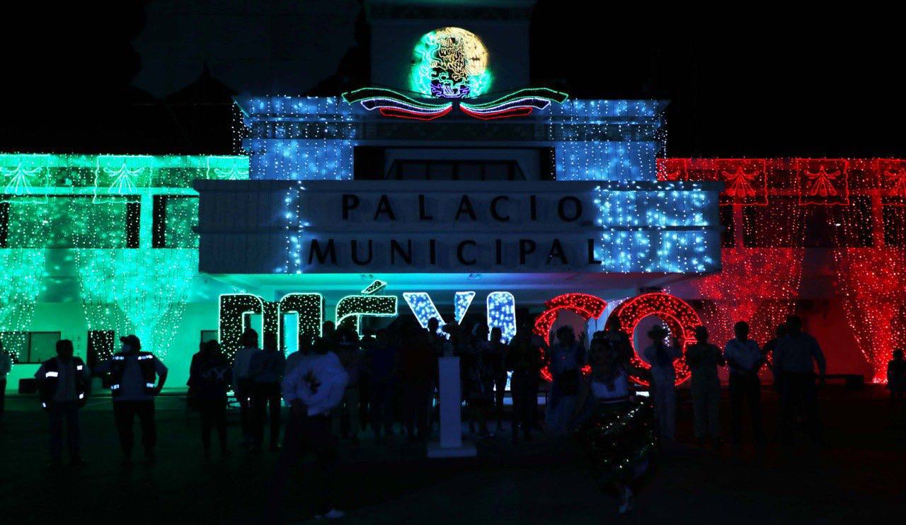 Playa del Carmen, Solidaridad, 6 de septiembre de 2022.- Como parte de las celebraciones del mes patrio, la presidenta Lili Campos realizó el tradicional encendido de luces iluminando el palacio municipal, la plaza cívica 28 de Julio, el Portal Maya, dos parques, así como adornos sobre 10 de las principales vialidades de la ciudad.