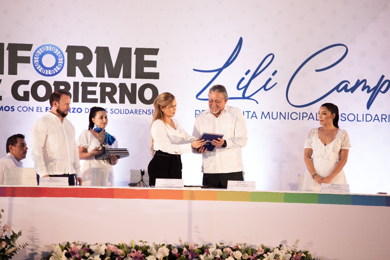 Al sumar los logros de este primer año de gobierno, Campos agradeció al gobernador Carlos Joaquín el apoyo que recibió Solidaridad, durante su mandato. “Bajo su liderazgo Quintana Roo se sintió seguro en esos momentos tan complicados y las familias sintieron su apoyo, su cariño y su respaldo” en tanto que a la gobernadora electa, Mara Lezama, le reiteró: “Tengo muy claro que para construir el bienestar de las y los solidarenses resulta fundamental hacer equipo con el gobierno estatal”.