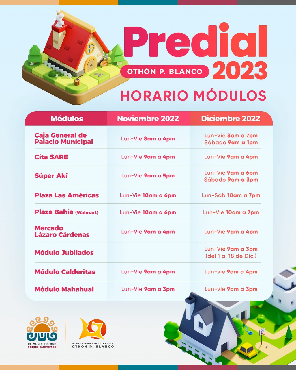 Asimismo, el módulo de jubilados (a un lado de la delegación del ISSSTE), este 16 de diciembre, trabajará de 9 am a 3 pm; y la alcaldía de Calderitas labora de lunes a viernes de 9 am a 4 pm mientras que su similar de Mahahual de lunes a viernes de 9 am a 3 pm.