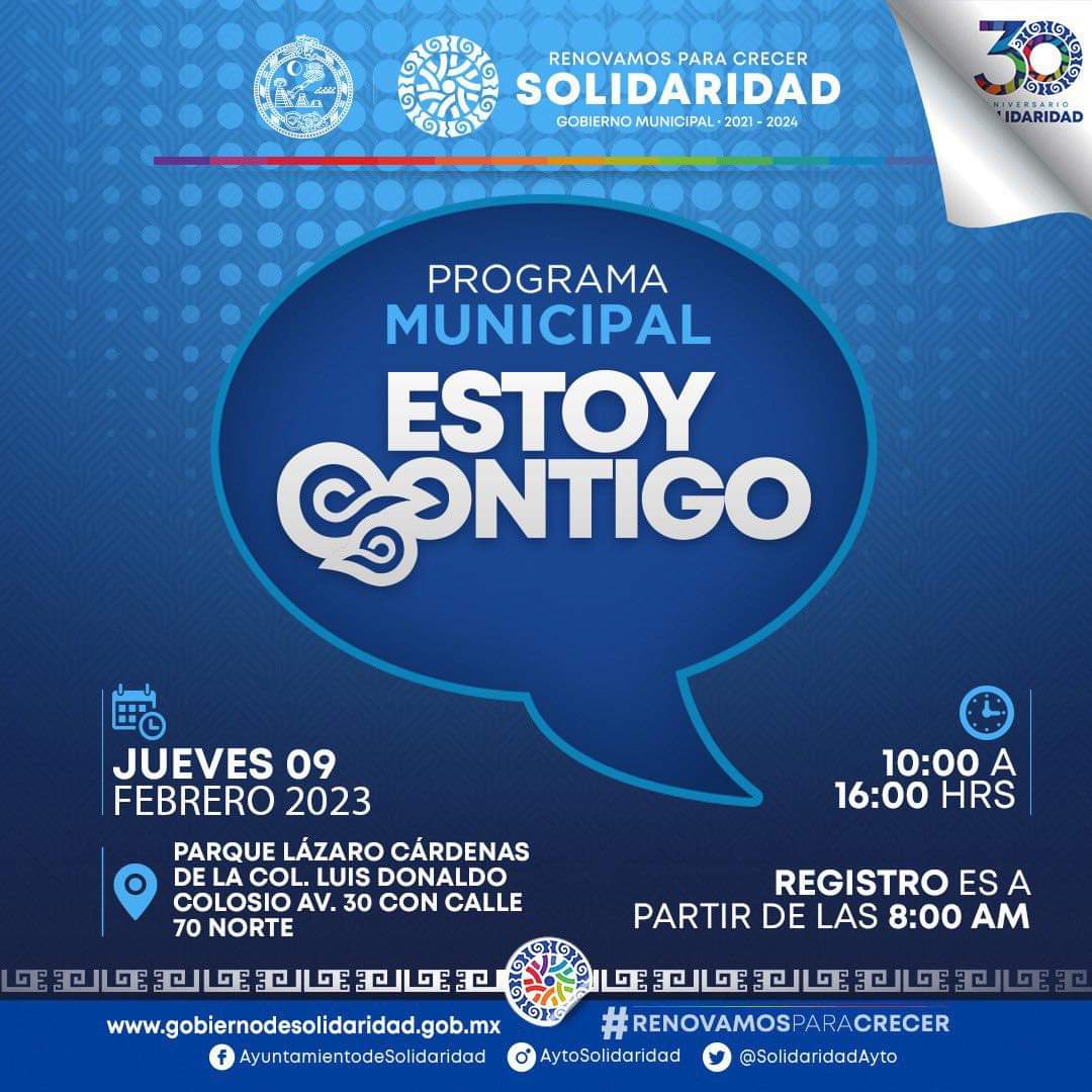 Playa del Carmen, Solidaridad, 8 de febrero del 2023.- Para acercar a la gente los servicios que proporciona el Ayuntamiento y atender de forma directa a las y los solidarenses, la presidenta Lili Campos encabezará el programa “Estoy Contigo” en el parque de la colonia Colosio este jueves 9, a partir de las 10 de la mañana.