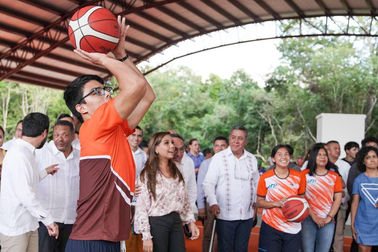 Cancún.- Con el propósito de fomentar las actividades deportivas, culturales y cívicas de alrededor de mil 420 estudiantes que asisten a su formación profesional en la Universidad Politécnica de Quintana Roo, la gobernadora Mara Lezama les entregó un domo deportivo y cancha de usos múltiples en la institución.