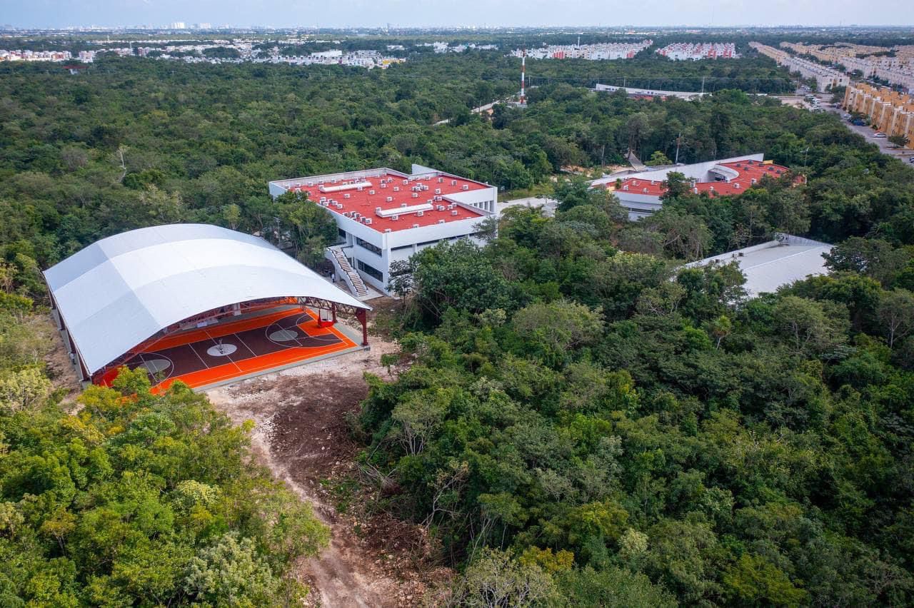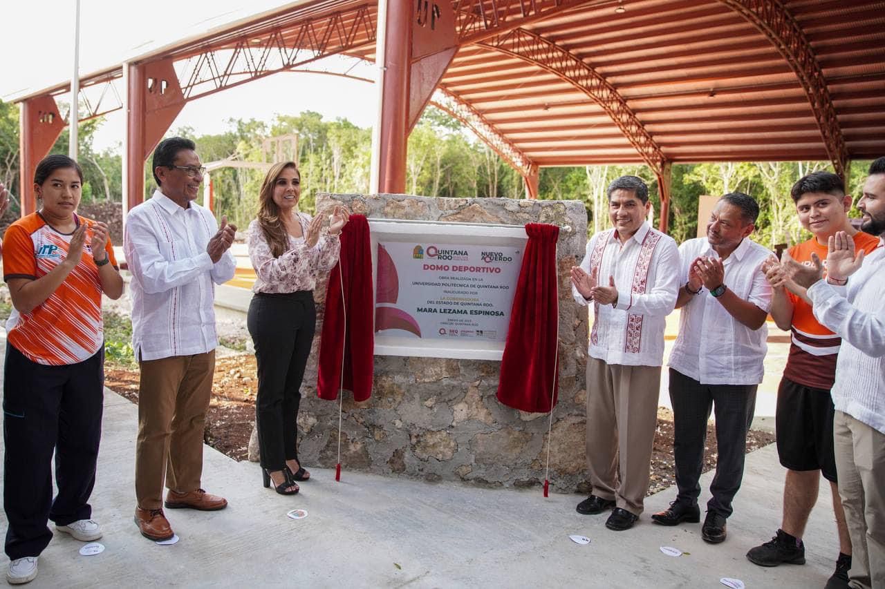 Cancún.- Con el propósito de fomentar las actividades deportivas, culturales y cívicas de alrededor de mil 420 estudiantes que asisten a su formación profesional en la Universidad Politécnica de Quintana Roo, la gobernadora Mara Lezama les entregó un domo deportivo y cancha de usos múltiples en la institución.