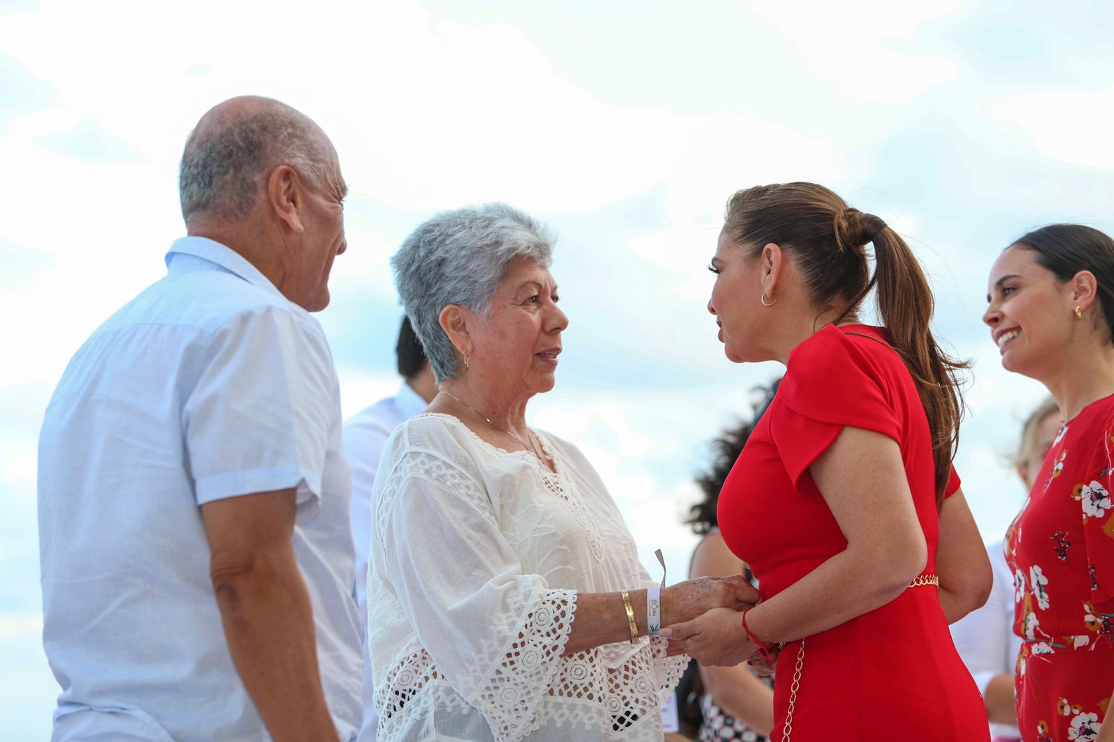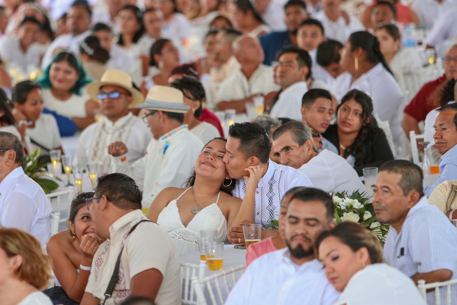 Cancún.- La gobernadora, Mara Lezama Espinosa, fue testigo de la unión legal de 402 parejas en Benito Juárez, que celebraron en Playa Marlín junto a sus familias, con quienes compartió su alegría y satisfacción de constatar cómo las parejas hacen equipo para caminar de la mano, para que en caso de ser necesario uno jale al otro y nadie se quede atrás.