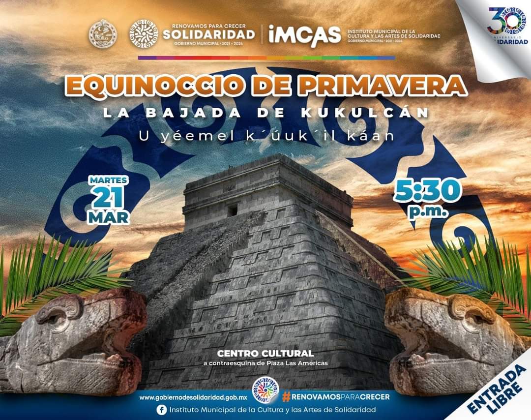 Playa del Carmen, Solidaridad a 19 de marzo del 2023.- Para fomentar y preservar las tradiciones y cultura, el gobierno municipal que encabeza Lili Campos, a través del Instituto Municipal de Cultura y las Artes (IMCAS), invita a celebrar el inicio de la primavera con la ceremonia “Bajada de Kukulcán”, el 21 de marzo en la palapa del Centro Cultural.