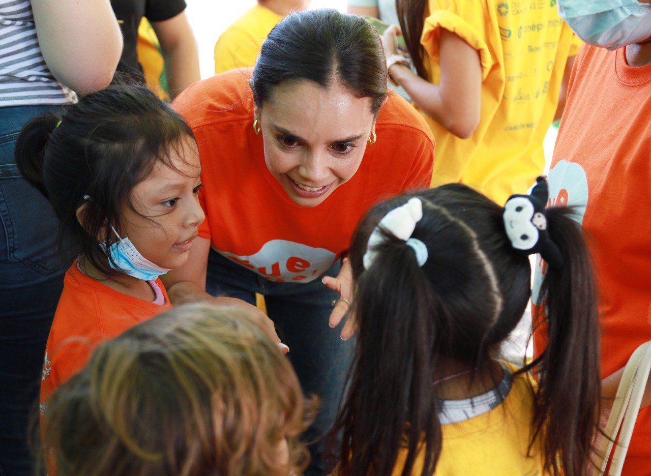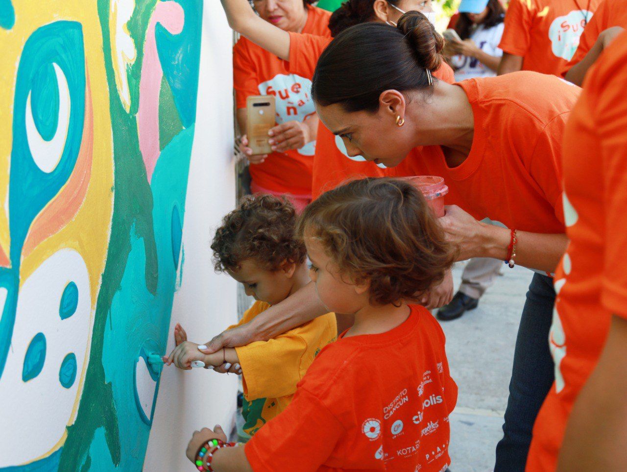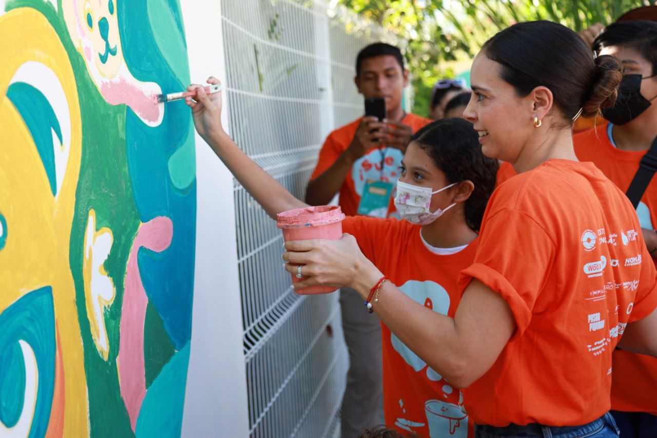 Acompañada de sus hijos y junto con niños, adolescentes y padres de familia, la Primera Autoridad Municipal pintó una parte de los murales que se diseñaron para la calle He-Zaba, en el exterior del Centro de Atención Múltiple (CAM) «Eduardo Huet», los cuales consistieron en tres corazones con fauna y flora nativa de Cancún.