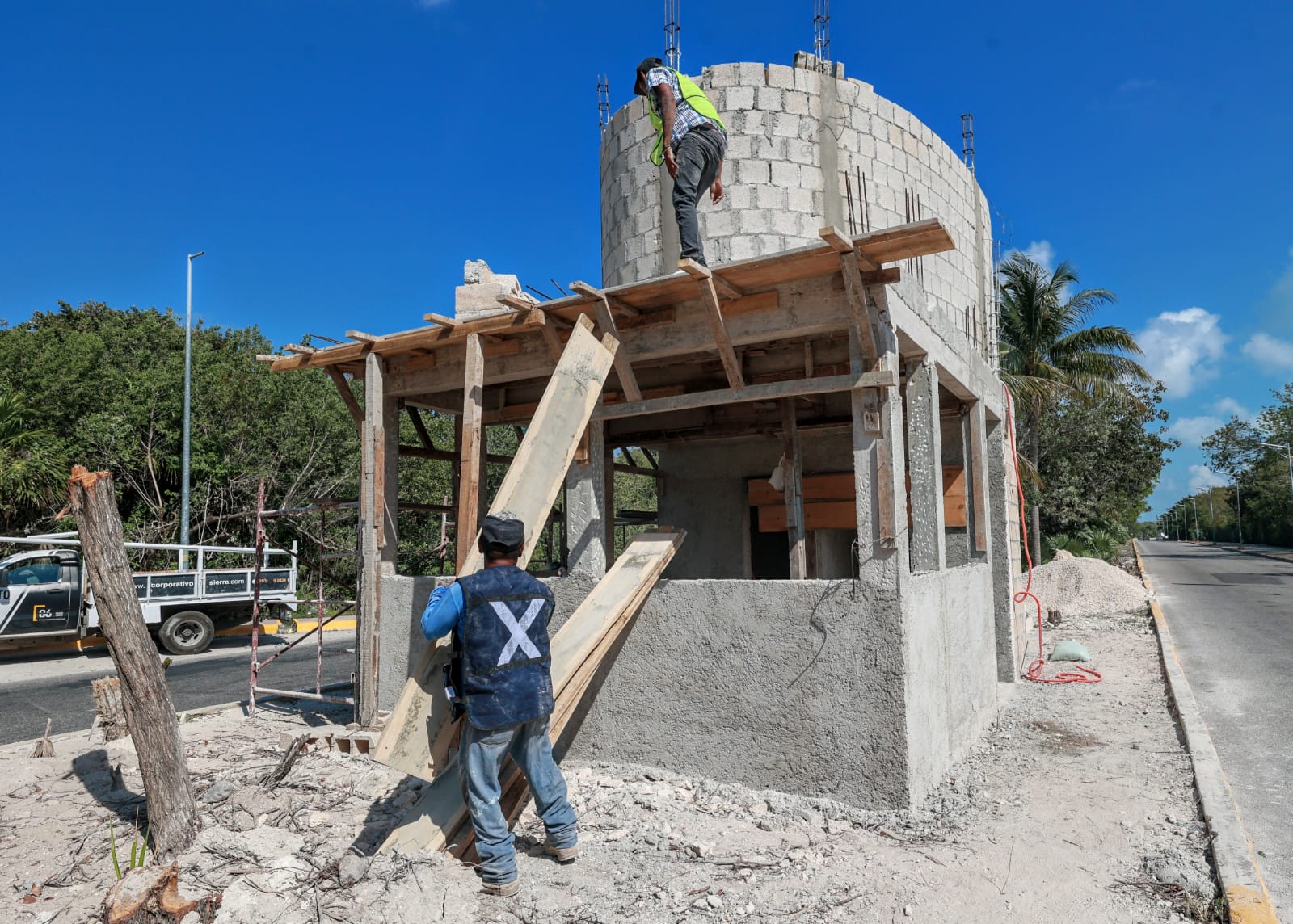 ISLA MUJERES, 5 DE ABRIL DE 2023.- Para brindar mayor seguridad y tranquilidad a miles de personas que pasan a diario hacia Costa Mujeres y residencial de la Zona Continental de Isla Mujeres, además de mejorar la imagen urbana, se construye la caseta de seguridad policíaca que se ubica en la carretera intermunicipal Prolongación Bonampak- Punta Sam.