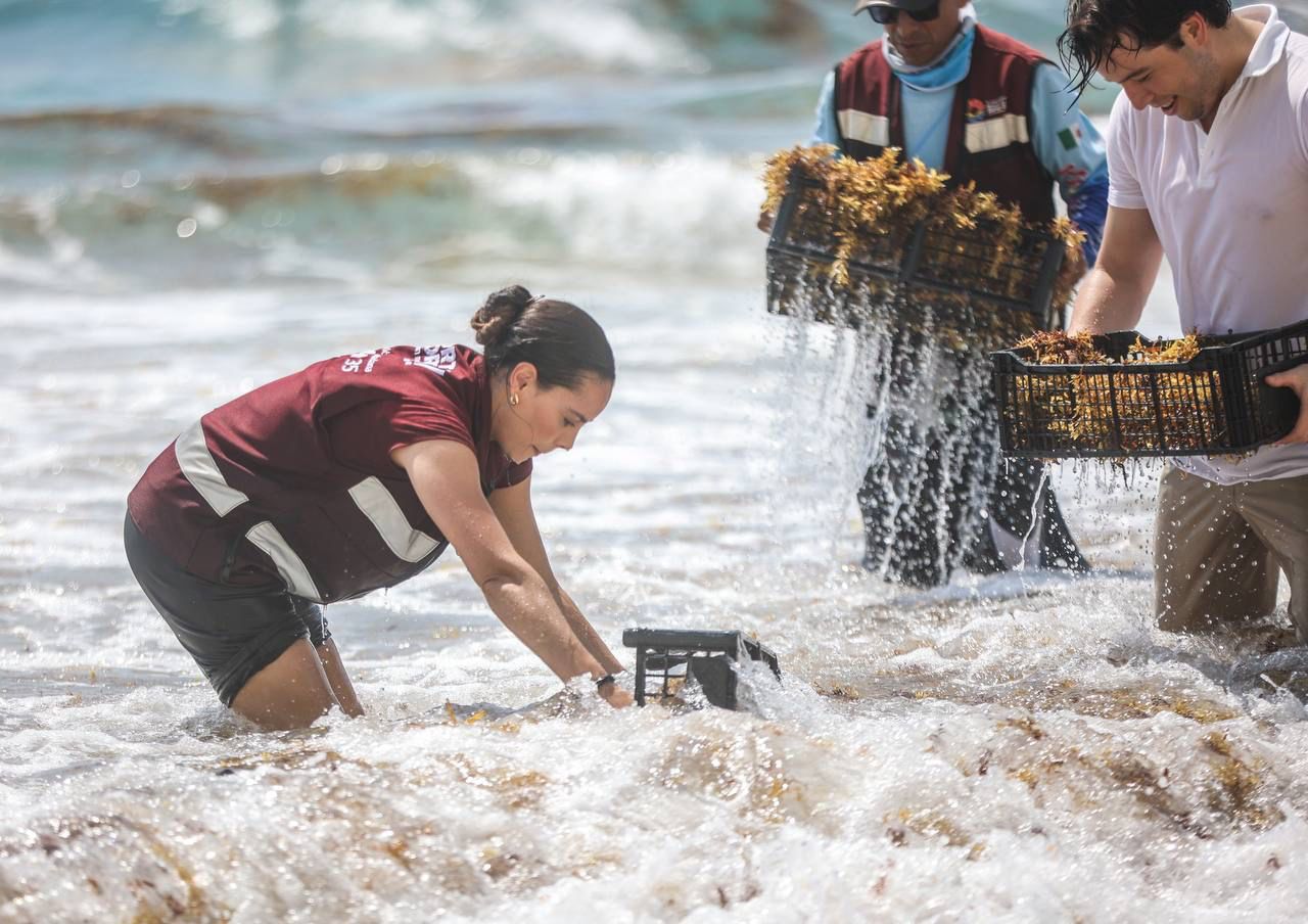 Acompañada por el director general de Servicios Públicos, Antonio de la Torre Chambe; así como por la titular de Certificación y Mantenimiento de playas de la Zona Federal Marítimo Terrestre (Zofemat), Karla María Hernández Guerra y el secretario municipal de Turismo, Juan Pablo de Zulueta; la Primera Autoridad Municipal constató los trabajos y se unió a la recolección de esta macroalga.