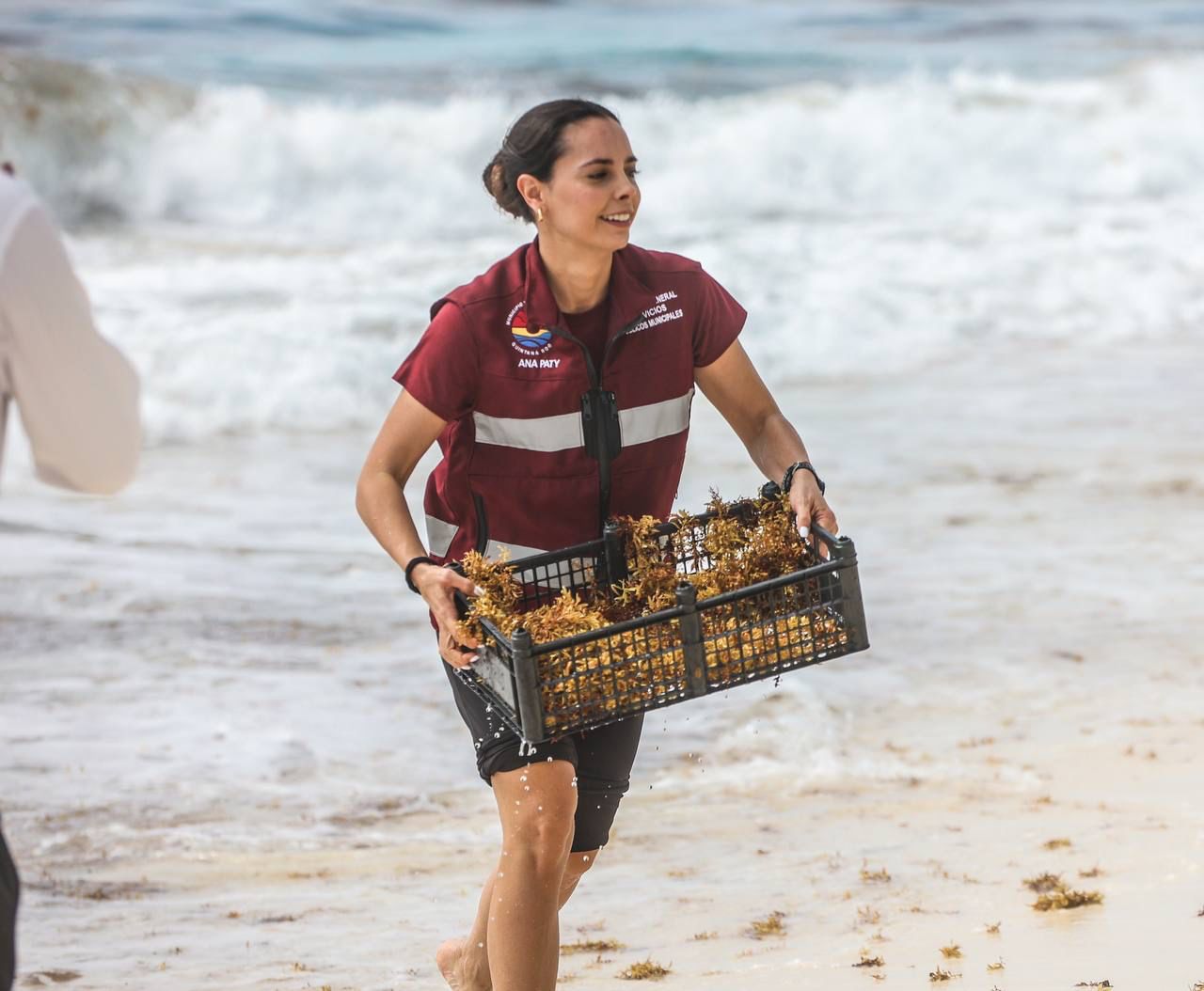 Acompañada por el director general de Servicios Públicos, Antonio de la Torre Chambe; así como por la titular de Certificación y Mantenimiento de playas de la Zona Federal Marítimo Terrestre (Zofemat), Karla María Hernández Guerra y el secretario municipal de Turismo, Juan Pablo de Zulueta; la Primera Autoridad Municipal constató los trabajos y se unió a la recolección de esta macroalga.