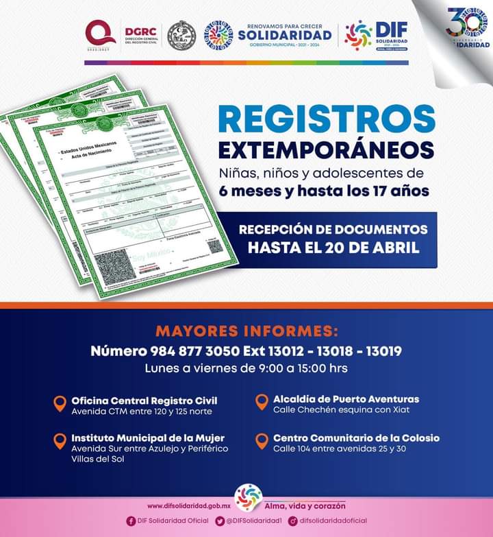 Playa del Carmen, Solidaridad, 8 de abril del 2023.- Con el objetivo de proteger a los menores de edad, el gobierno que encabeza la presidenta Lili Campos, a través de la Dirección del Registro Civil Municipal, convoca a los papás de niñas, niños y adolescentes, entre seis meses y hasta los 17 años de edad, a realizar el registro extemporáneo.