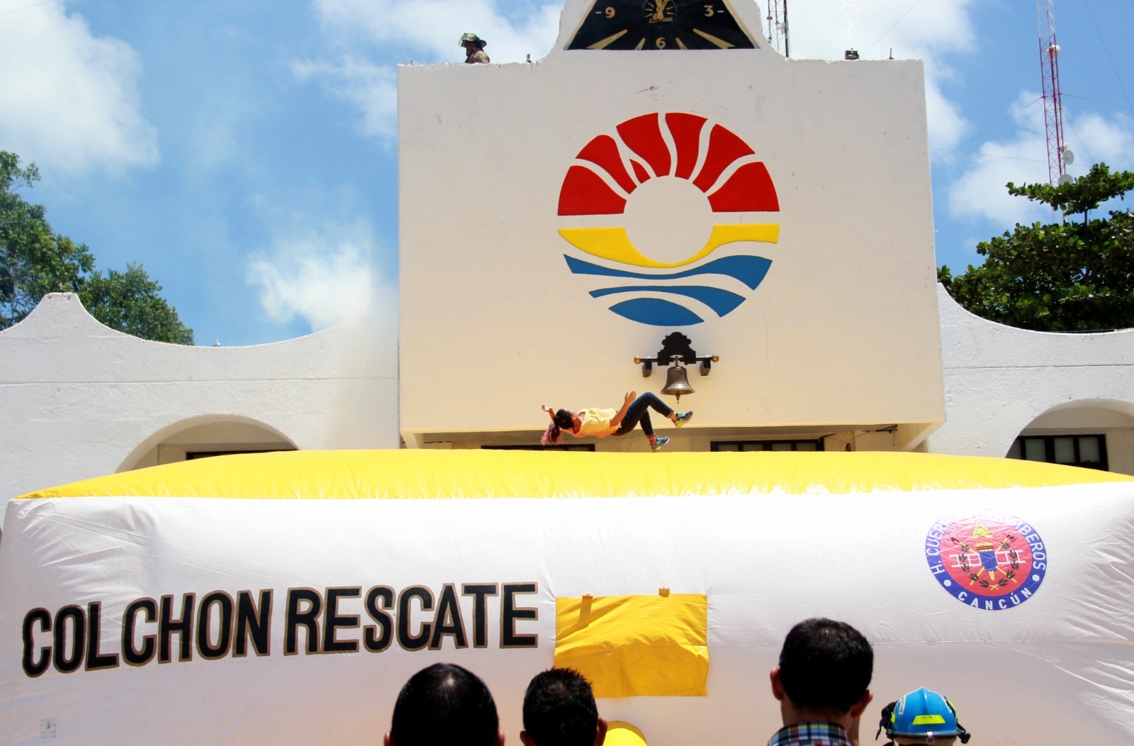 Junto a la gobernadora del estado, Mara Lezama, en su calidad de anfitriona la Primera Autoridad Municipal observó el simulacro y constató la participación de los colaboradores con elementos de Protección Civil y Bomberos, liderando la simulación de un incendio y rescate de una persona, desde el techo del Palacio Municipal.