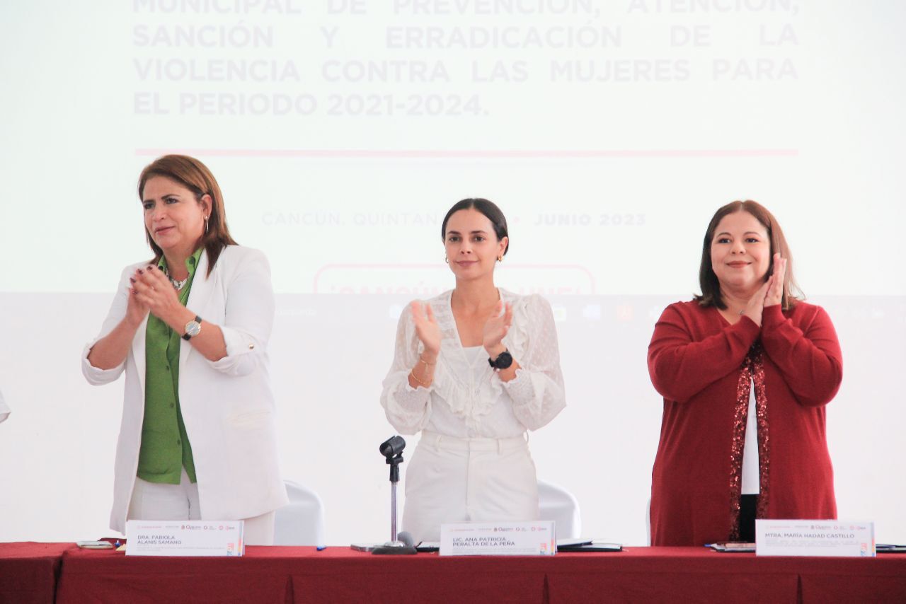 Cancún, Q. R., a 01 de junio de 2023.- “Este sistema que hoy instalamos es una respuesta justamente a todas la víctimas, a quienes sufren violencia económica, financiera; a quienes son amenazadas y vulneradas. A todas ellas, les decimos que no están solas, que estamos sumando todos los esfuerzos para darles espacios seguros, para que haya apoyos jurídicos y un acompañamiento. Para que haya ese respaldo por parte de las autoridades”, señaló la Presidenta Municipal de Benito Juárez, Ana Paty Peralta, al instalar junto a la Comisionada Nacional  para Prevenir y Erradicar la Violencia contra las Mujeres (CONAVIM), Dra. María Fabiola Alanís Sámano,  el Sistema Municipal de Prevención, Atención, Sanción y Erradicación de la Violencia contra las Mujeres 2021-2024.