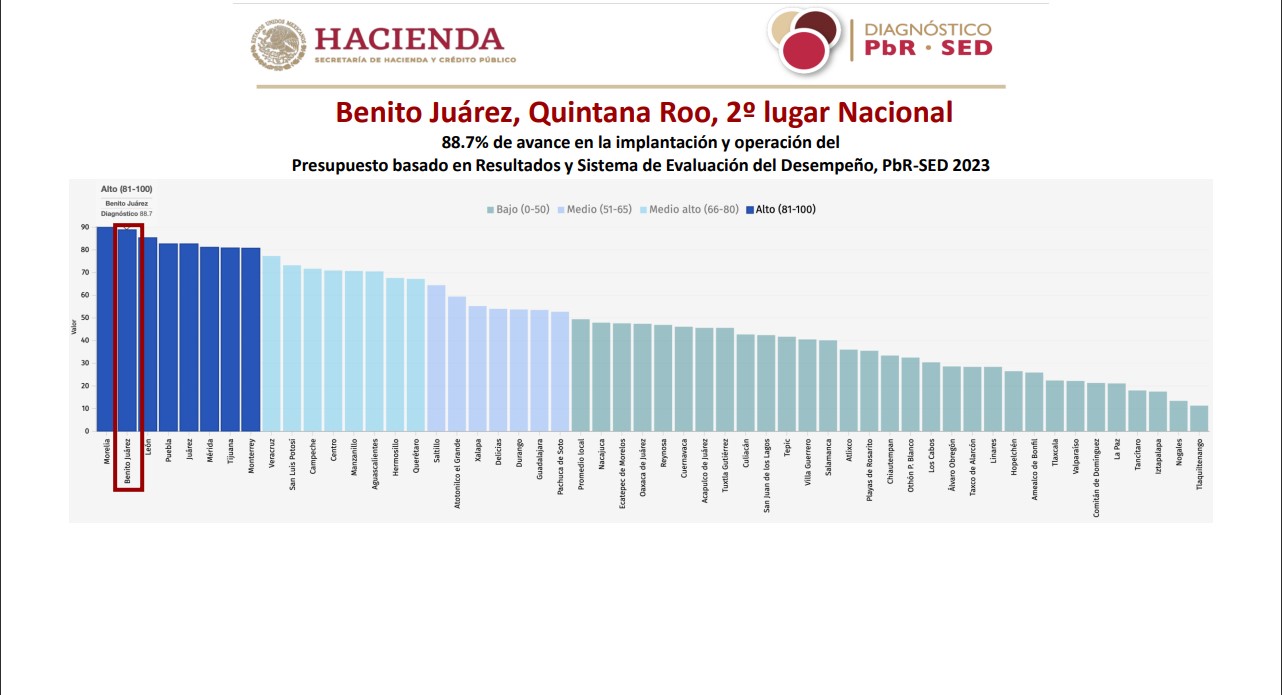 Los resultados del Diagnóstico PbR-SED 2023 señalan, dijo la Primera Autoridad Municipal, que la valoración obtenida por el municipio de Benito Juárez, con base en la información proporcionada, representa un avance de 88.7%, conforme al modelo definido por la Secretaría de Hacienda y Crédito Público, ubicándose en la posición 2 a nivel nacional de una muestra de 62 Municipios y dos DTCDMX.
