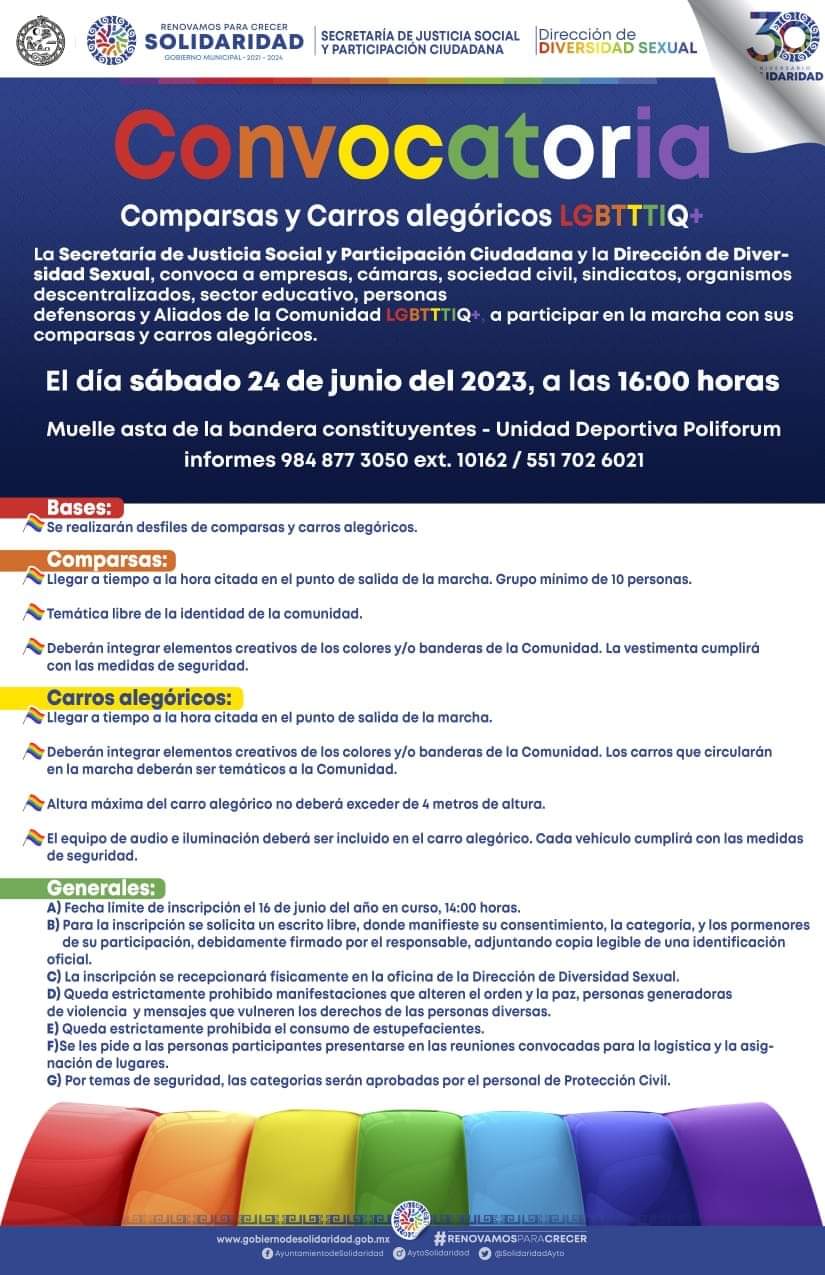 Para la marcha del orgullo se invita a la población en general a participar con carros alegóricos y desfile el próximo 24 de junio, desde las 16 horas, partiendo desde el asta bandera del muelle de la Constituyentes, hasta la unidad deportiva Poliforum, en la avenida Juárez con 110, donde amenizará el momento el show de Pavel Arámbula.