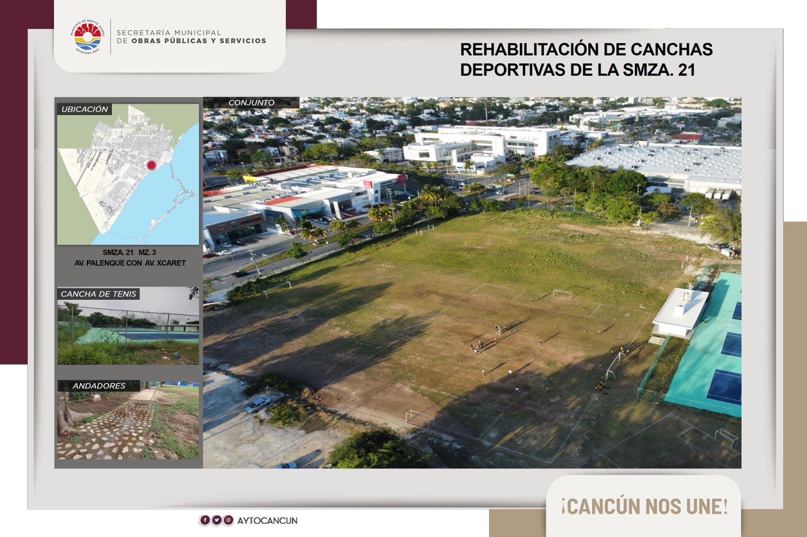 Las canchas de fútbol “Guillermo Cañedo” y “Cozumel”, así como la de tenis “Pancho Contreras”, serán rehabilitadas en su infraestructura con: pasto sintético, andadores, gradas, mobiliario, bancas para los jugadores, luminarias y cerca perimetral, para que los cancunenses realicen sus actividades deportivas, y fomenten la convivencia familiar.