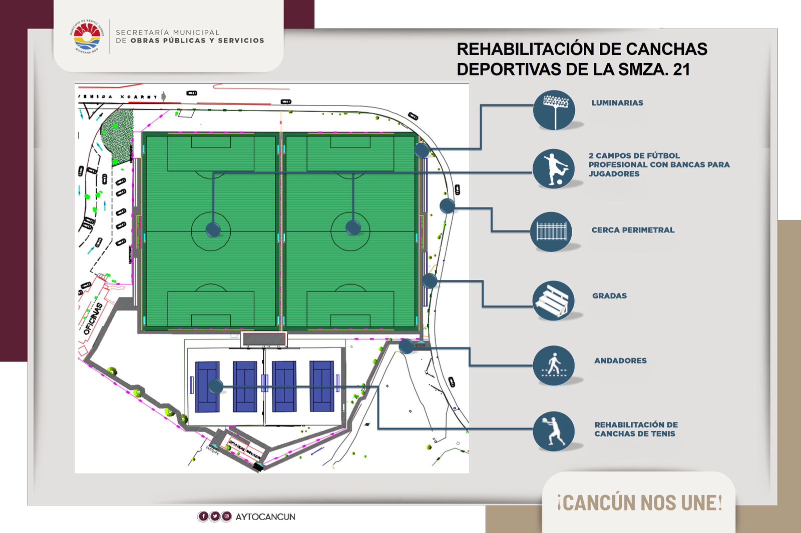 Las canchas de fútbol “Guillermo Cañedo” y “Cozumel”, así como la de tenis “Pancho Contreras”, serán rehabilitadas en su infraestructura con: pasto sintético, andadores, gradas, mobiliario, bancas para los jugadores, luminarias y cerca perimetral, para que los cancunenses realicen sus actividades deportivas, y fomenten la convivencia familiar.
