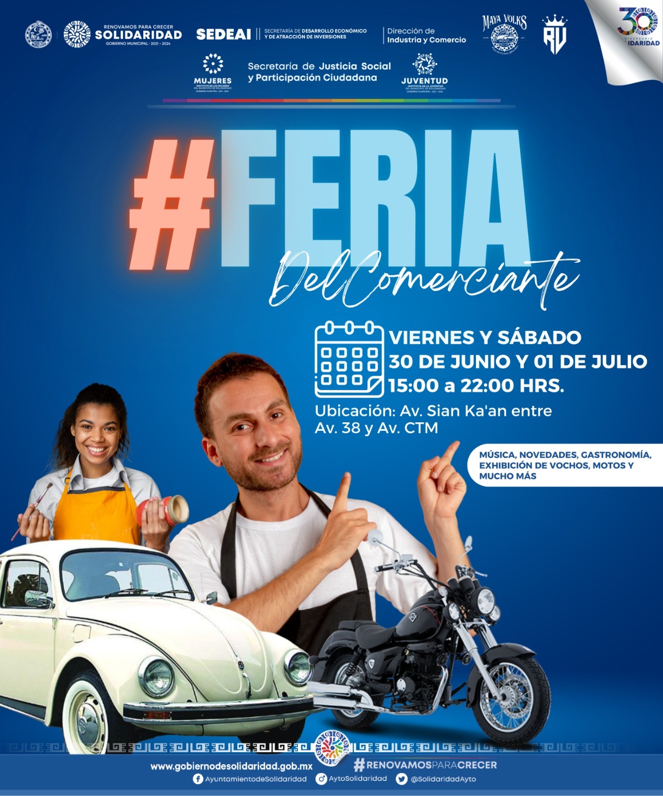 El próximo viernes 30 de junio y sábado 1 de julio, en la avenida Sian ka’an entre avenida 38 y CTM se realizará este evento donde participarán comerciantes afiliados al Instituto de la Juventud, Instituto de la Mujer y Dirección de Comercio.