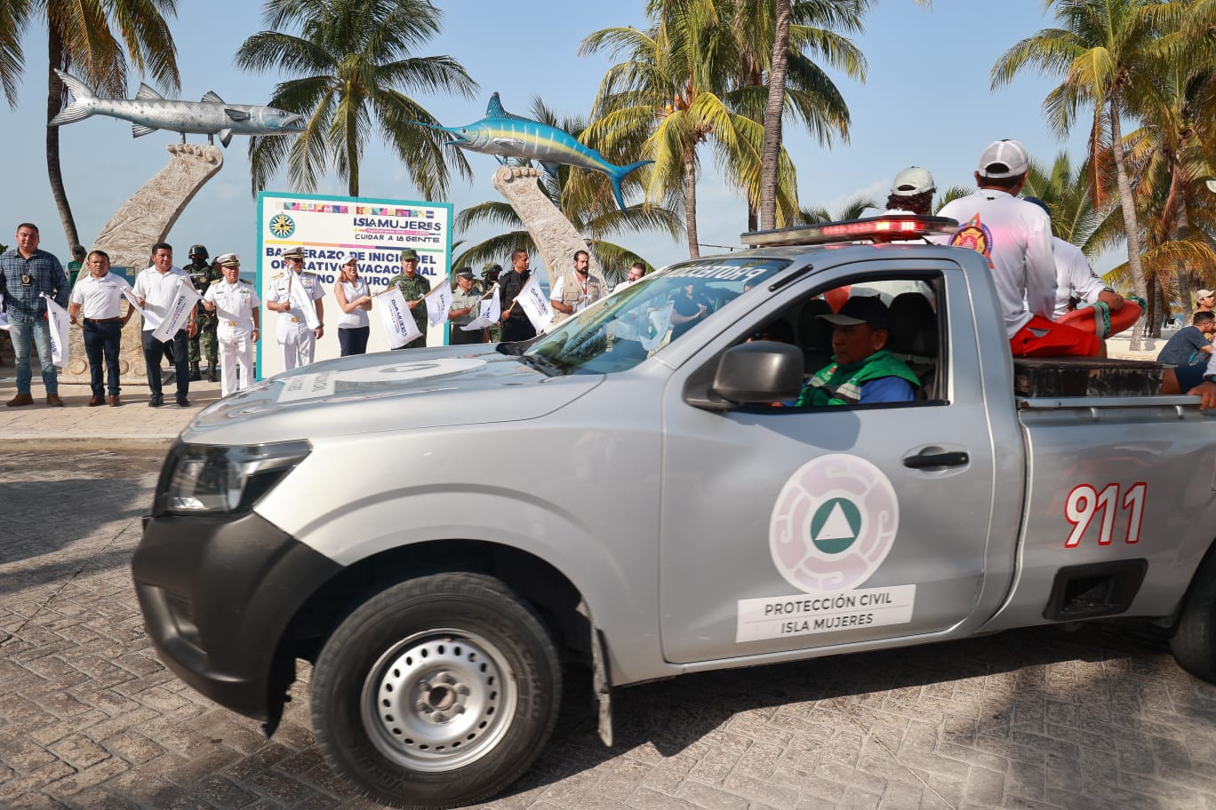 ISLA MUJERES, 14 de julio 2023.- Este viernes la presidenta municipal de Isla Mujeres, Atenea Gómez Ricalde dio el Banderazo de inicio del operativo vacacional «Verano Seguro 2023».