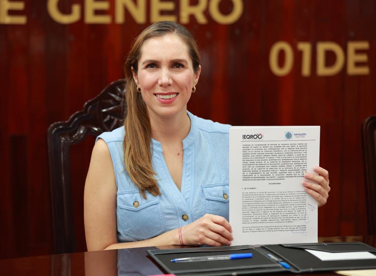 La firma del convenio se celebró en la Sala de Cabildo; por parte del Ayuntamiento firmó la Presidenta Municipal, Atenea Gómez Ricalde y en representación del IEQROO, lo hizo la Consejera Presidenta, Mtra. Ruby Pacheco Pérez.