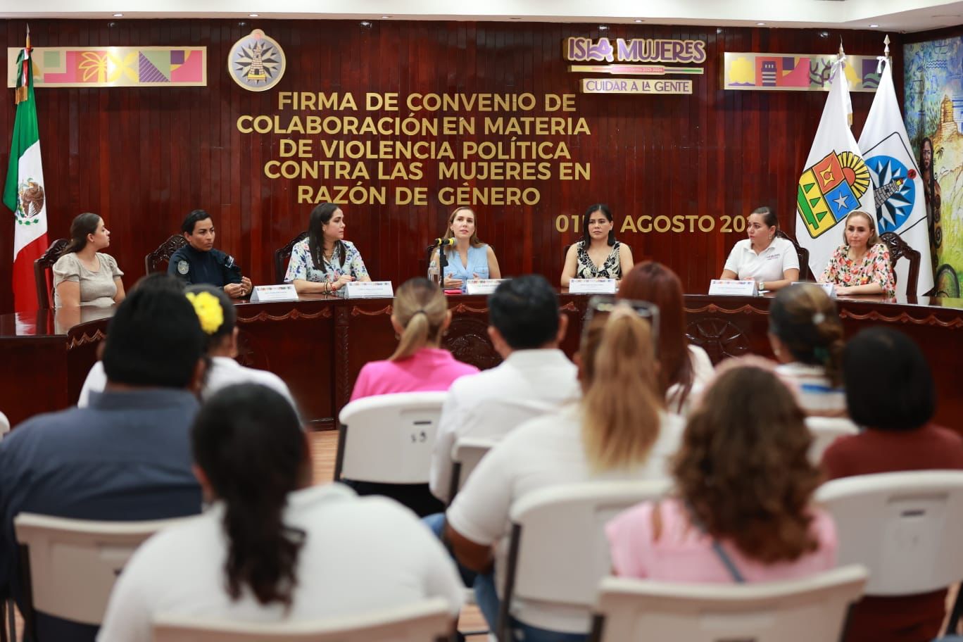 Isla Mujeres, Quintana Roo, 2 de agosto de 2023.- En un esfuerzo conjunto, el Ayuntamiento de Isla Mujeres, a través de la Instancia Municipal de la Mujer y de la Dirección General de Seguridad Pública y Tránsito, firmó un convenio de colaboración con el Instituto Electoral de Quintana Roo (IEQROO), para sumar esfuerzos en materia de Violencia Política contra las Mujeres en Razón de Género.