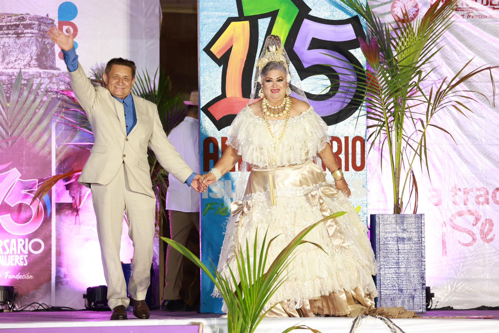 Durante la noche, Lucía Magaña y Ángel Ávila, realizaron una pasarela en el escenario de las Fiestas de Fundación, luciendo con porte y elegancia, los trajes típicos de Isla Mujeres. Los Reyes de Fundación representarán al pueblo isleño en este tradicional festejo, enalteciendo las actividades.