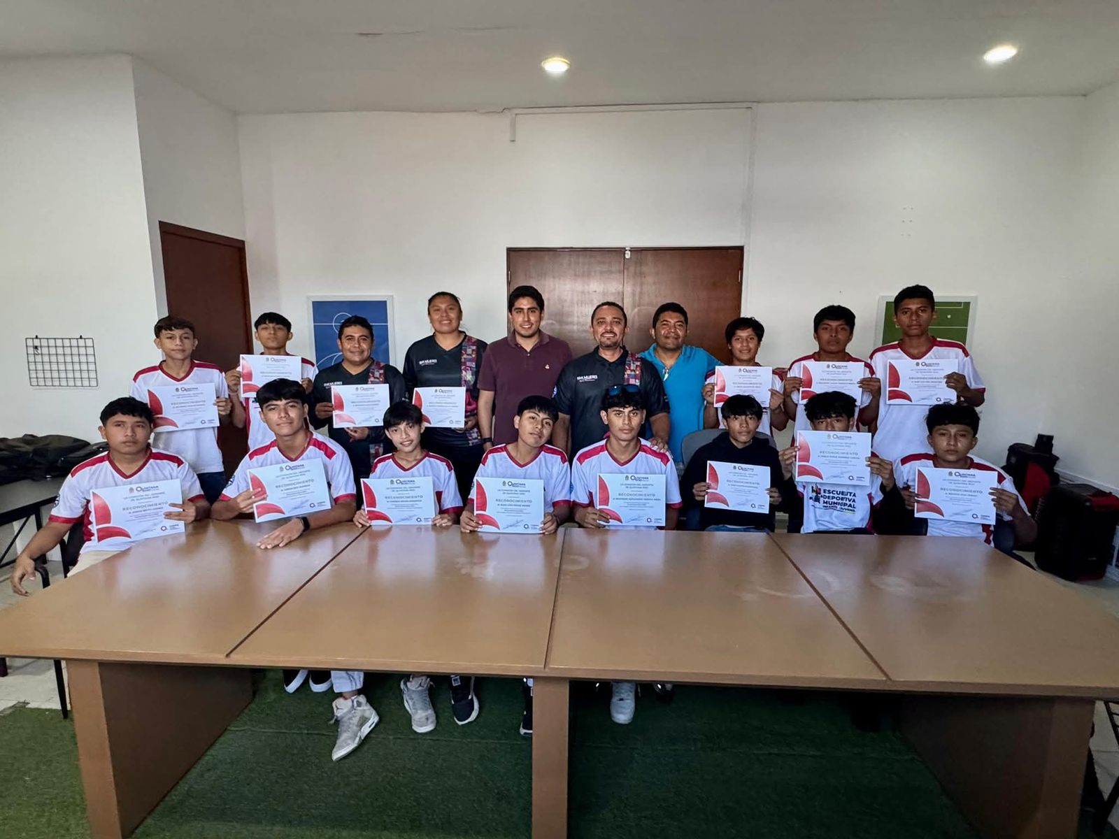 Isla Mujeres, Quintana Roo, 12 de diciembre de 2025.-Niños isleños que se coronaron como Campeones de la Selección Infantil Varonil del Torneo Estatal Socca, recibieron un reconocimiento por parte de la Comisión del Deporte de Quintana Roo (CODEQ).