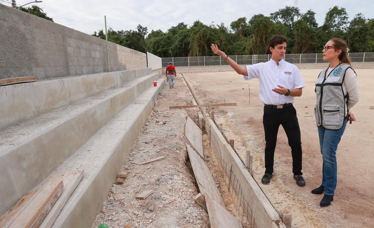 Isla Mujeres, Quintana Roo, 26 de enero de 2026.- Como parte del compromiso de fortalecer la infraestructura deportiva y social en Ciudad Mujeres, la presidenta municipal, Atenea Gómez Ricalde, supervisó de manera directa los avances de la construcción de la primera cancha de fútbol 7 en la historia de la Zona Continental, una obra emblemática que se edifica en la colonia La Loma.