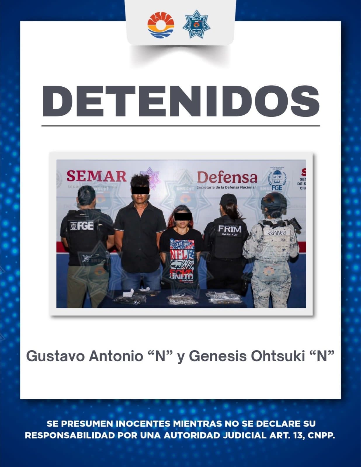 Por lo anterior, Gustavo Antonio “N”, de 32 años de edad, y Génesis Ohtsuki, de 35 años de edad, fueron detenidos y puestos a disposición de la Fiscalía General del Estado para las diligencias legales correspondientes.