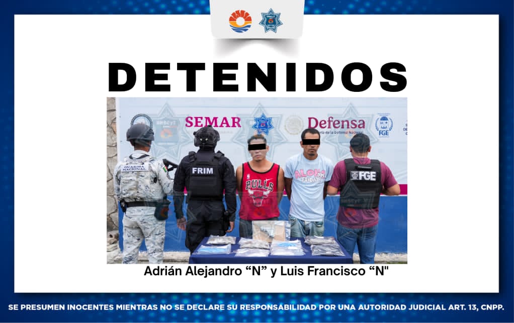 Cancún, Q. Roo., a 29 de enero de 2026.- En una acción coordinada entre la Fiscalía General del Estado (FGE), Guardia Nacional y la Secretaría Municipal de Seguridad Ciudadana y Tránsito (SMSCyT), se logró la detencón de dos hombres, presuntos implciados en delitos contra la salud, en la modalidad de narcomenudeo.