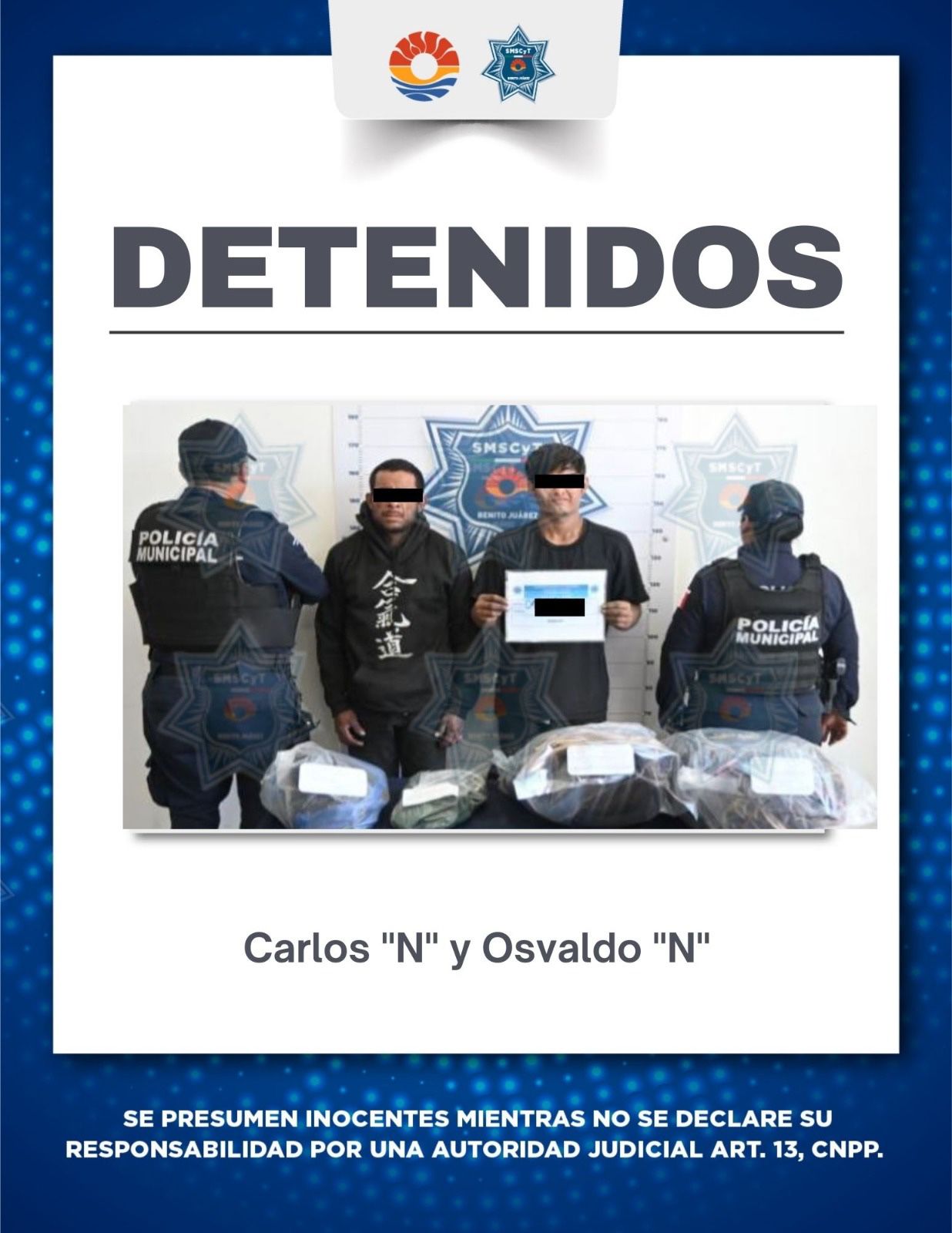 Cancún, Q. Roo., a 05 de febrero 2026.- Agentes de Policía Cancún detuvieron a Carlos “N”, de 34 años de edad, y Osvaldo “N”, de 30 años, presuntos implicados en el delito de robo.