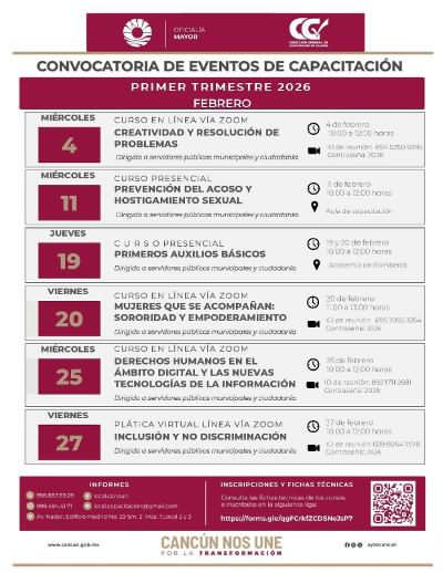 Cancún, Q. R., a 07 de febrero de 2026.- El Ayuntamiento de Benito Juárez, a través de la dirección general de Capacitación en Calidad, tendrá este febrero varios contenidos para la protección de la integridad de grupos vulnerables como mujeres.