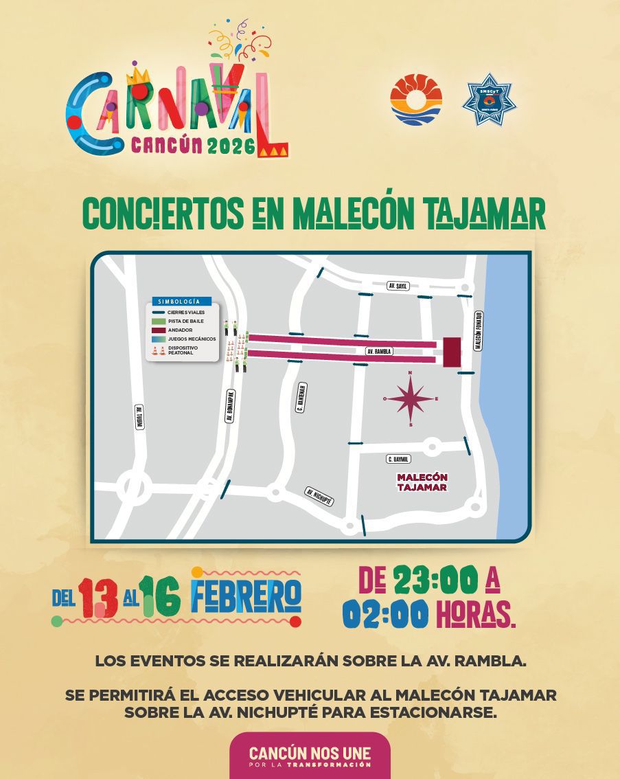 Del 13 al 16 de febrero, el emblemático Malecón Tajamar alegrará a las y los cancunenses con los conciertos al aire libre con artistas como La Adictiva, Corpusklan, Emerald Band, Julio Baro, Keira Juárez, Bronco y María José, los cuales se presentarán en la Av. Rambla de las 23:00 a 02:00 horas, por lo que solo se permitirá el acceso vehicular al Malecón sobre la Av. Nichupté para estacionarse.