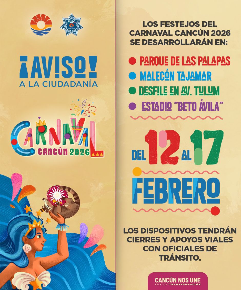Cancún, Q. R., a 10 de febrero de 2026.- Con motivo del gran Carnaval Cancún 2026, el Ayuntamiento de Benito Juárez, a través de la Dirección de Tránsito Municipal, informó a la ciudadanía sobre los dispositivos viales implementados por las diferentes actividades que se desarrollarán del 12 al 17 de febrero, en el Parque de Las Palapas, Malecón Tajamar y el Estadio Sherwin-Wiliams antes “Estadio Beto Ávila”, así como el desfile en la avenida Tulum.