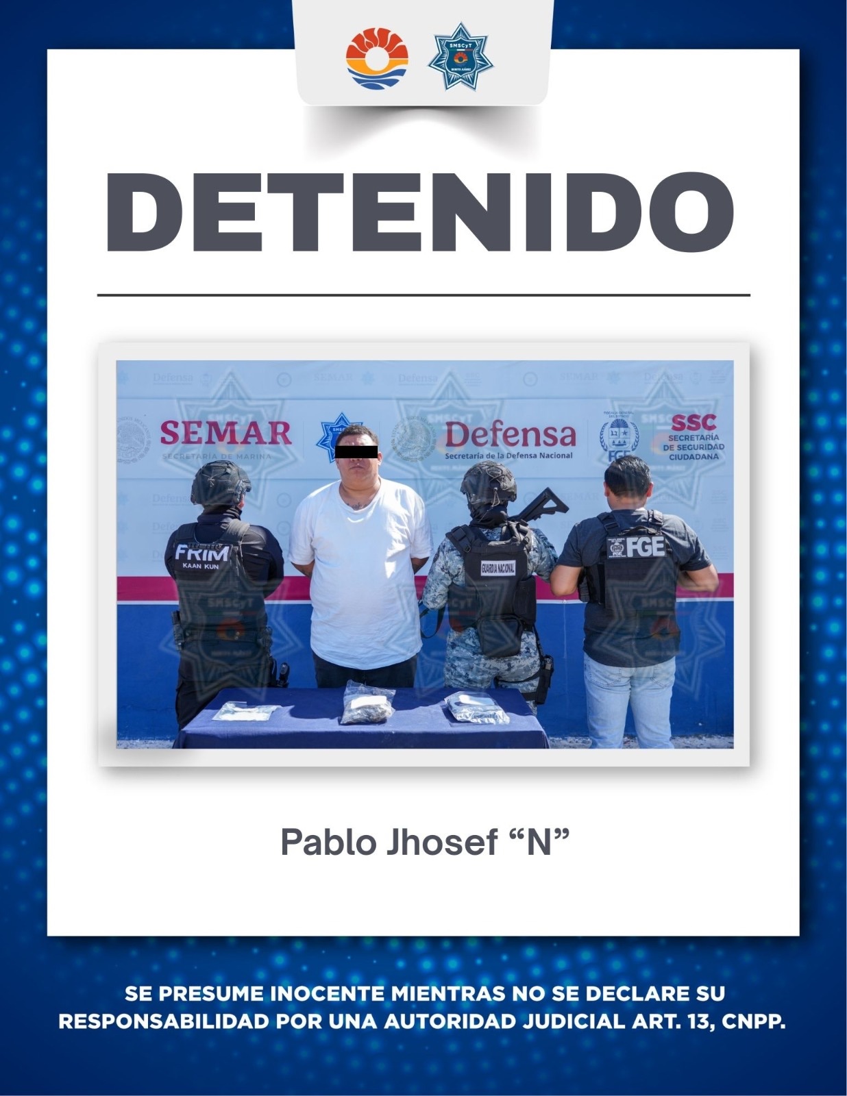 Por lo anterior, Pablo Jhosef “N”, de 29 años de edad, fue detenido y puesto a disposición de la Fiscalía General del Estado para los trámites legales correspondientes.