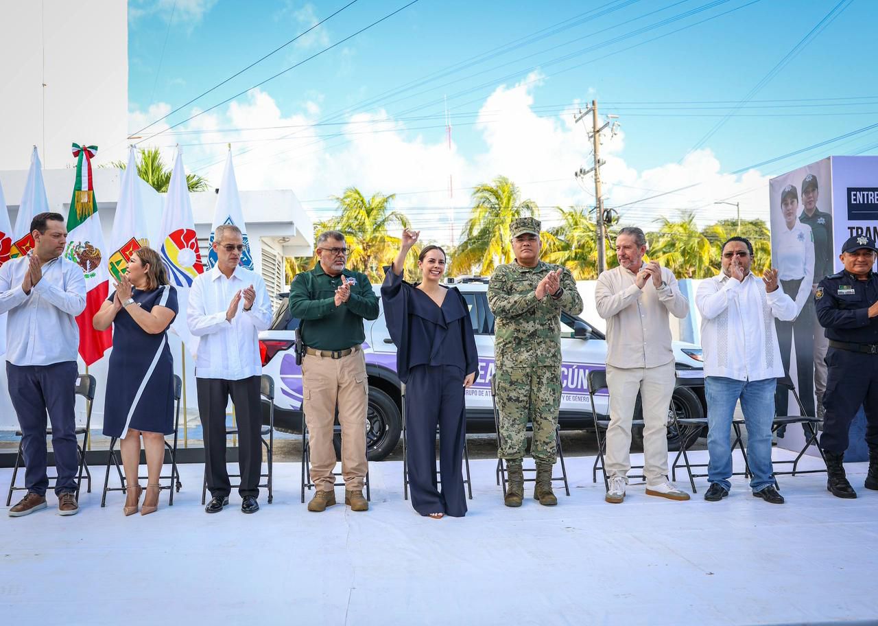 Cancún, Q. R., a 24 de febrero de 2026.- Con el objetivo de dignificar la labor de las y los policías y continuar avanzando en la recuperación de la tranquilidad de las familias benitojuarenses, la Presidenta Municipal, Ana Paty Peralta, encabezó la entrega de uniformes para la Transformación Policial en la explanada de la Secretaría Municipal de Seguridad Ciudadana y Tránsito.