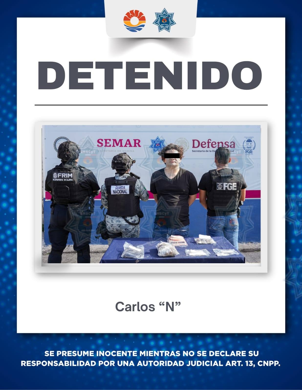 Los hechos se registraron en la Supermanzana 213, durante el operativo Blindaje Cancún, cuando los agentes observaron a un hombre junto a una camioneta manipulando diversos envoltorios con características similares a narcóticos.