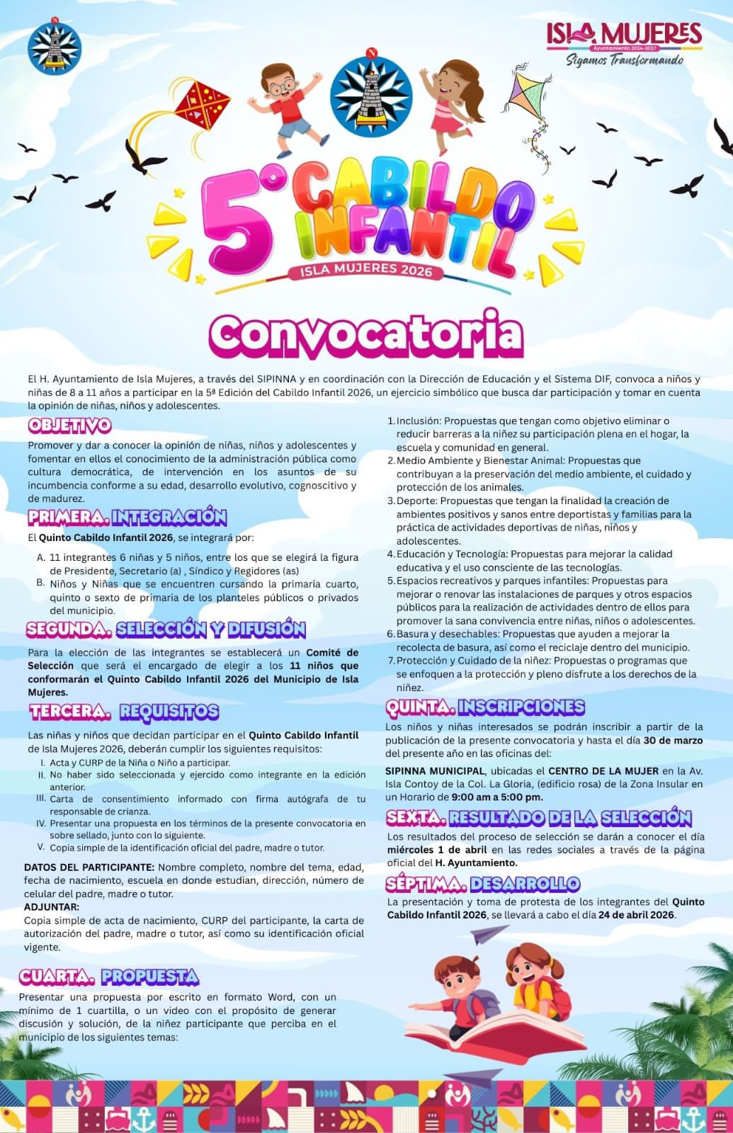 Isla Mujeres, Quintana Roo, a 20 de marzo de 2026.– Como parte de su compromiso con la participación de la niñez, el Gobierno Municipal de Isla Mujeres, encabezado por la Presidenta Municipal Atenea Gómez Ricalde, lanzó la convocatoria de la quinta edición del Cabildo Infantil 2026.