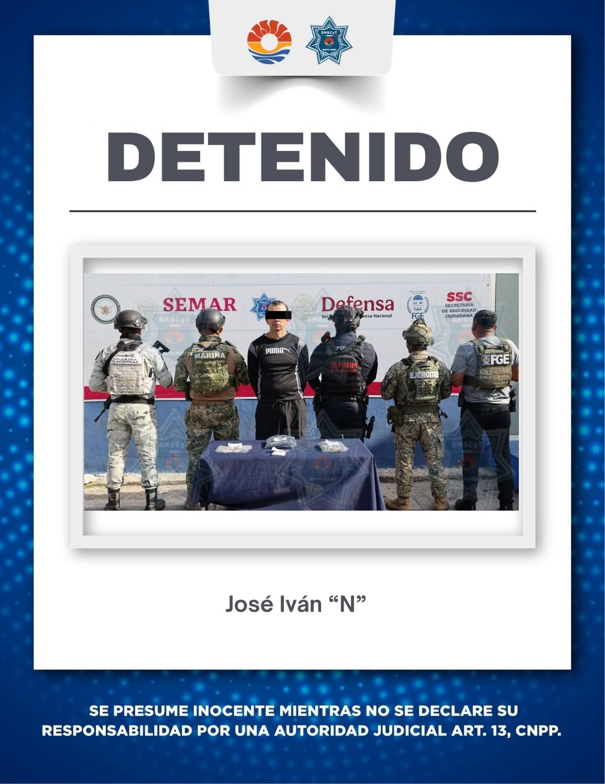 Cancún, Q. Roo., a 28 de marzo de 2026.- En el marco del operativo Blindaje Cancún, que se lleva a cabo de manera coordinada entre la Policía Cancún, la Fiscalía General del Estado (FGE), la Guardia Nacional, el Ejército Mexicano y la Secretaría de Marina, se realizó la detención de un hombre por su presunta participación en delitos contra la salud, en la modalidad de narcomenudeo.